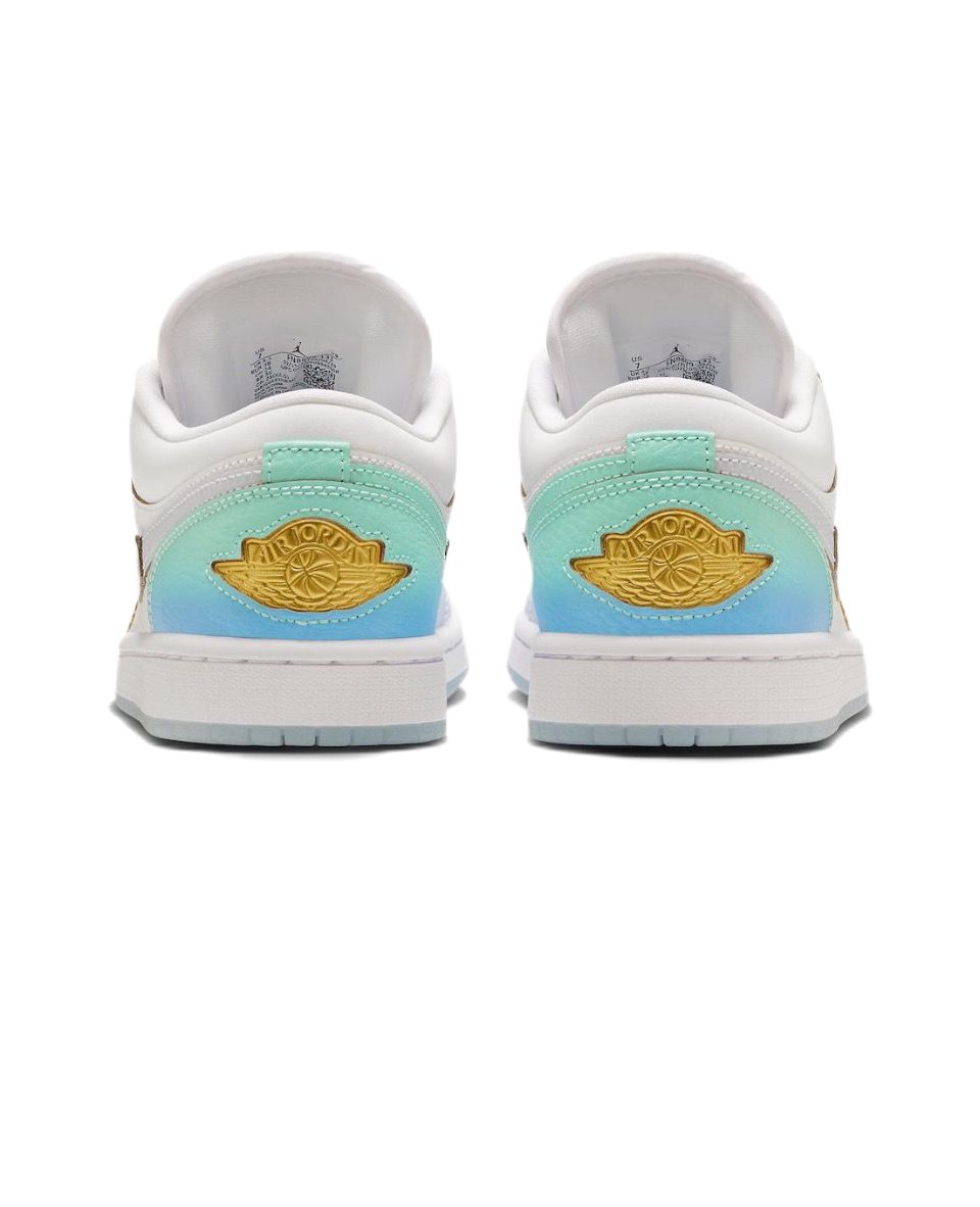 The Jordan 1 Low SE Emerald Rise boasts a striking colorway with a white leather base and ice-blue tumbled leather overlays. Gradient shades of sky blue to pale green adorn the eyestays and heel, while the side-panel Swoosh features a unique ice-blue to pale green transition. Gold accents, including a Wings logo on the heel and a Jumpman on the toe box, add a touch of luxury to this iconic silhouette.