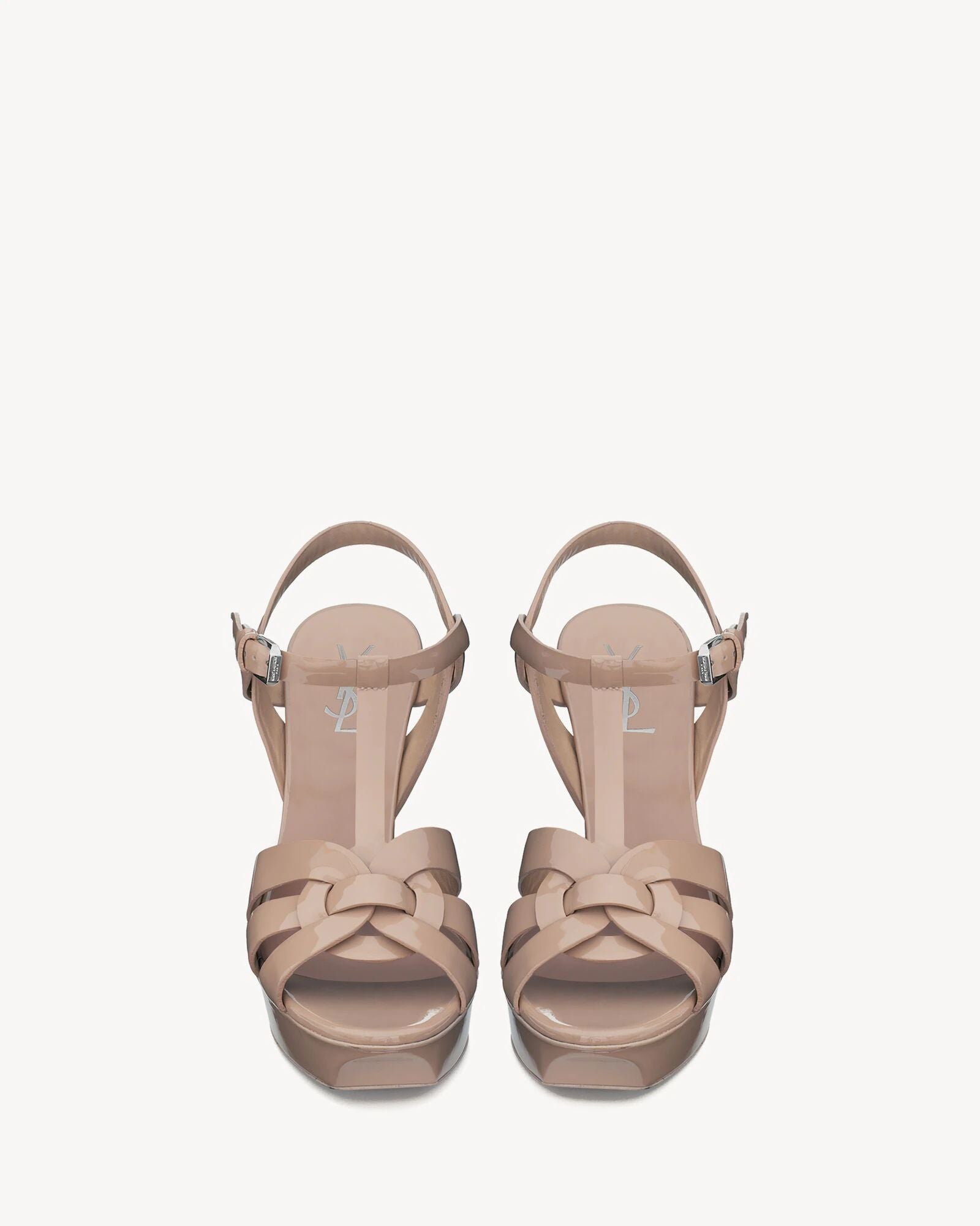 High heel stiletto sandals with intertwining straps, featuring a beveled platform, covered heel and adjustable ankle strap engraved with Saint Laurent Paris.